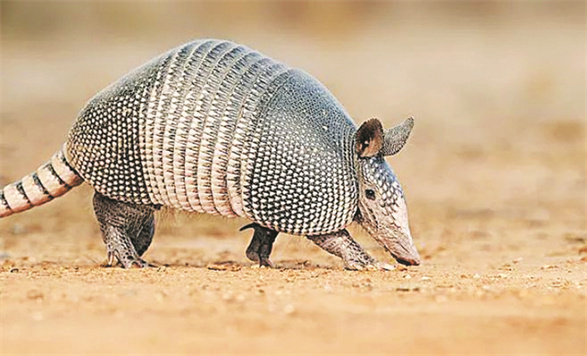 犰(qiú)狳(yú)是一种带壳的哺乳动物,遇到危险时会蜷成一个球,用坚硬的外壳保护自己。大犰狳是犰狳中体型最大的一种,身长可达到1米多,不过尾巴占了长度的一半。它们爱吃蚂蚁和白蚁,但其他昆虫、腐肉,以及蜗牛、小蜥蜴等也是它们的食物。