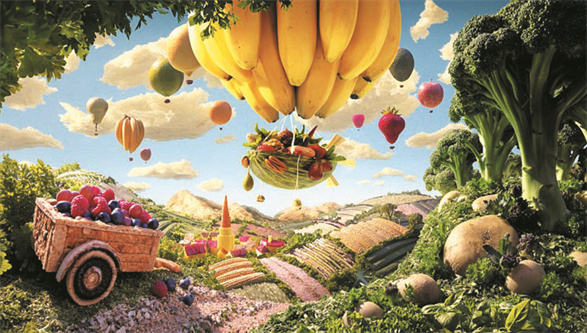 炫NEWS 小食物 大世界 伦敦摄影师Carl Warner将面包、西兰花、番茄、土豆、黄瓜、巧克力、糖果、牛肉、海鲜……布置成景致,变成童话里的样子,拍摄出惊艳的静物风景。精妙的搭配让整个场景现实感十足,细节的把控丝毫不会让人感觉刻意和做作,食物的形状和颜色都被摄影师化作“风光大片”中的元素,大饱眼福的同时又让人垂涎三尺。