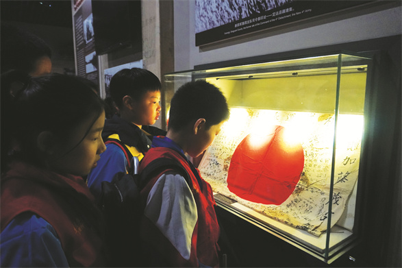 学生记者们走进司令部所在的罗里村,迎面白墙上就是叶挺军长手书的“抗战到底”四个大字。走进纪念馆,讲解员为大家详细介绍了这支铁血军队:“新四军是中国共产党直接领导的抗日武装力量,中国人民解放军的前身之一。1938年,新四军军部移驻云岭,指挥华中敌后各抗日战场的新四军部队。在叶挺、项英领导下,新四军将士活跃在大江南北,英勇抗敌,在中国革命史册上,留下了光辉的一页。”在纪念馆展厅中,学生记者们浏览着大量文史资料,详细学习了解新四军将士当年英勇战斗的故事和军民共同抗战的历史,观看新四军战士曾在战火硝烟中遗留下来的长枪、短枪、手榴弹、地雷……一件件珍贵文物,犹如一页页历史画卷将大家带入烽火连天的岁月。参观中,学生记者们看到叶挺、项英、周子昆等领导人工作和起居的场所,他们的生活设施简陋得令人惊讶:两张长桌、两把椅子竟是叶挺军长的办公室;一张简易的长桌是新四军团以上干部开会的地方;两个凳子和几块砖头上加块木板便是战士的床铺,而新四军的军魂就是在这里铸就的。