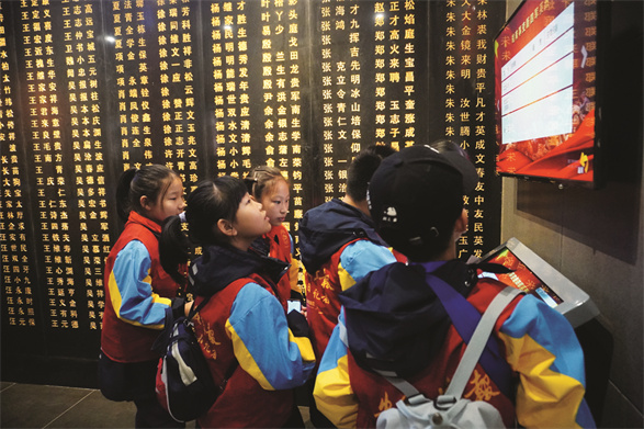 望着整面墙的烈士名单,学生记者们不禁满含热泪。五(2)班的傅璟琦无限感慨:“我仿佛看见了那些拿着沾满血迹的枪支向前冲锋的战士们,他们‘抛头颅,洒热血’,为人民奋勇杀敌,他们的精神让敌人胆寒;也让我们见到了人民的力量。今天的新生活来之不易,一定要珍惜,我们必须保卫好烈士们用生命换来的新中国!”