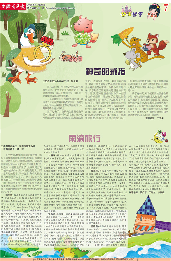 奇幻岛 神奇的戒指 □肥西县肥光小学六(7)班 解天毅 很久以前的一个夜晚,天神宙斯在夜幕中巡逻。突然他的手指触碰到了一颗滚烫的星星,他马上抽回手来,但他手上的戒指掉落在动物世界中。 一个凉爽的午后,白鹅先生和白鹅小姐结婚了,动物们都呼朋唤友来庆祝。白鹅先生拿出了一枚镶着红宝石的漂亮戒指,小心翼翼地给白鹅小姐戴上。 三年过去了。白鹅先生出差总是不回来,把白鹅小姐一个人丢在家。她一边无聊地扭动着戒指上的红宝石,想把它摘下来,一边抱怨着,“讨厌!要是他能不出差,陪我玩几天就好了!”话音刚落,白鹅先生竟然出现在家里。白鹅小姐目瞪口呆,没想到自己刚刚许的愿望竟然实现了。她想,原来这就是传说中天神宙斯手上的戒指啊!她想起了总是欺负自己的野鸭小姐,她笑了笑,扭动了一下红宝石。“我希望野鸭小姐能突然出现在我家的火炉里,被烧伤。”话音刚落,野鸭小姐就出现在了火炉里,被火烤得乱窜。哈哈,她得意地笑了。她跑到了城里,扭动红宝石,让自己拥有了一座漂亮的别墅;她跑到了乡村,扭动红宝石,让村里的动物都来给自己奉上美味的食物;她跑到了大湖边,扭动红宝石,让湖里的鳄鱼都听她指挥,去攻击一群可怜的小鸭…… 终于有一天,动物们都开始反击白鹅小姐,她刚想扭动戒指上的红宝石,就被豹子撞倒了,红宝石戒指也掉到了地上,她刚想扑过去捡,红宝石戒指就被大象一脚踩碎了。白鹅小姐赶紧逃到河里,再也不敢上岸了。白鹅小姐终于明白:权力是为了更好地为人服务,滥用权力会给自然界造成破坏,是不会有好结果的。 指导老师 王亚男