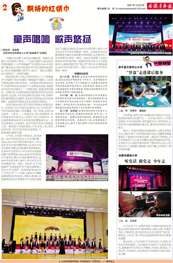 “西塞山前白鹭飞,桃花流水鳜鱼肥。青箬笠,绿蓑衣,斜风细雨不须归……”这曲《渔歌子》是合肥市师范附属第三小学“微微童声”合唱团在2021年初安徽广播电视台大型合唱《春之声》节目录制的参演作品,学生们将激情融入歌声中,唱出了一幅山水美景,给大家带来了一场视听盛宴。