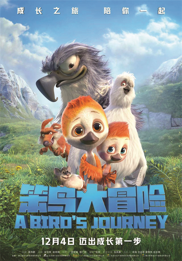 《笨鸟大冒险》 《笨鸟大冒险》以鸻鹬鸟小伊的视角,讲述了它克服心中恐惧,最终突破自我学会飞翔的华丽成长之旅。刚出生的鸻鹬鸟因练习飞行时遭遇老鹰袭击而没能学会飞行,直到冬天到来群鸟南飞之时,不会飞行的它被迫离队,只能徒步前往避难地——天堂谷。在被天敌追击的过程中,它爬过悬崖,越过草地,翻越山岭,成长为了更勇敢的自己。 在影片发布的定档海报中,“主人公”小伊护住身旁的小雅警惕地目视前方,两人身后,它们的天敌——老鹰正虎视眈眈地望着它们,胶着的场景让人不禁为小伊捏了一把汗,也开始担心它究竟能否保护住自己的朋友?能否学会飞翔?这场冒险之旅也因此充满了挑战和未知。