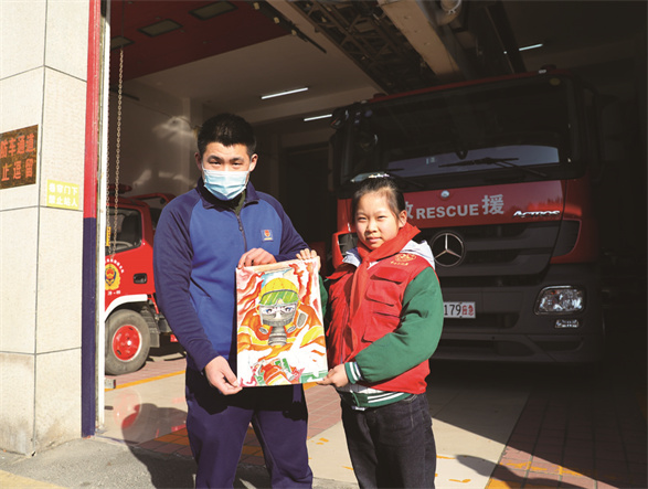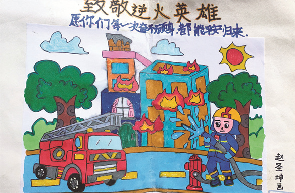 学生记者 王思凝:妈妈说消防员的每次救援都是把生的希望留给别人,我拿出自己在家画的救火场景图送给消防员叔叔,我想告诉他们:每次救援,一定要平安归来,他们保护着我们,我们也希望他们永远平安。