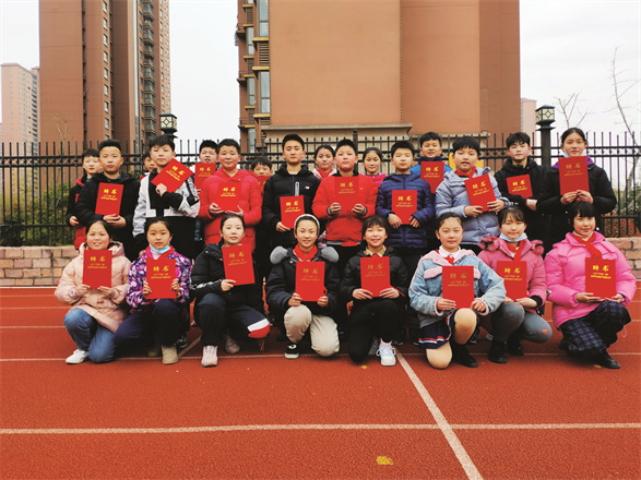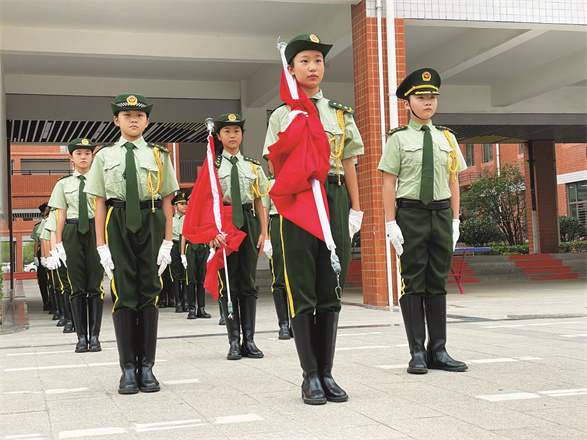 魅力社团 合肥市永红路小学北城世纪城分校国旗护卫队社团 你好 国旗护卫队 □黄世凤 李 鹤 王 霞 同学们,你是否仰慕过天安门国旗护卫队整齐划一的步伐?你是否想过自己穿着制服庄严地升起一面鲜红的五星红旗?合肥市永红路小学北城世纪城分校的小小护旗手们很荣幸就有这样的机会,每周一的升旗仪式上,伴随着齐刷刷的正步声,一队精神抖擞、斗志昂扬的小护旗手亮相在学校的操场上。他们挺拔的身姿、庄重的表情、规范的行进步伐,让全体师生不由自主地肃穆起来,鲜红的国旗如同火焰一般,点燃了青少年作为新时代接班人的一腔赤诚,也化为永红路小学北城世纪城分校的一抹绚丽的色彩,接下来让我们一起来了解一下学校的国旗护卫队社团吧! 永红路小学北城分校国旗护卫队社团创建于2021年1月,现共有护旗手30人。自成立以来,国旗护卫队不但肩负着学校日常的升降旗任务,还多次出色地完成了校运动会、开学典礼等活动的升降旗仪式。出色完成任务的背后是老师严格要求下坚持不懈的训练,以及小护旗手们不怕苦、不怕累的坚持,哪怕汗流浃背,也会认真对待,力求做到完美。老队员毕业,新队员加入,一批批的小学生走进这个特殊的集体,不断地接受磨练和考验。 国旗护卫队的成立,不仅让学生们感受了升旗仪式的庄严、肃穆,同时也提高了学生团结协作、吃苦耐劳的品质,相信同学们心中的爱国之情也会日益升华。在将来,国旗护卫队的小队员们一定会秉承努力向上、顽强拼搏的精神,向世界展示自己的风采! “小小护旗手”有话说 五(11)班 孙梦琪:刚加入国旗护卫队的时候,每天的训练不仅枯燥无味,还特别累,我甚至想过放弃。但是,慢慢地我爱上了这个集体,在这个让人充满自信的社团,没有懒惰,只有努力、加油! 六(6)班 韩依焱:对国旗护卫队的最初记忆,是我五年级的时候,一个周一的升旗仪式上,我看到六年级的哥哥姐姐,英姿飒爽地行进在操场上,当时心想:太帅了!我什么时候也能成为其中的一员就好了。后来学校二次选拔的时候,我真的有幸成为其中一员,我非常珍惜这次机会,每次准时参加训练,从不缺席。 五(11)班 陈远灿:刚加入国旗班时,老师对我们的要求极高,身子挺拔,手臂伸直,步伐一致。在国旗班让我最大的感触不是辛苦,而是无比的光荣!今后我将继续努力,严格要求自己,为班级、为学校、为社会贡献自己的一份力量。