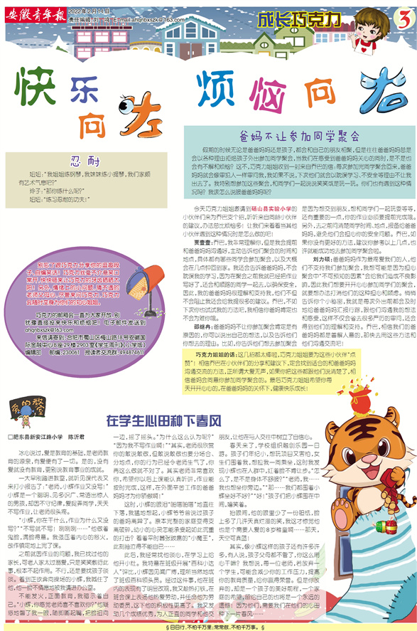 刘力硕:爸爸妈妈作为最疼爱我们的人,他们不支持我们参加聚会,我想可能是因为担心聚会中“不可预知的因素”会给我们造成不良影响,因此我们想要开开心心参加同学们的聚会,就要想办法打消他们的这种担心和顾虑。悄悄告诉你个小秘密,我就是每次外出前都会及时地给爸爸妈妈汇报行踪,跟他们沟通我的想法和感受,这样不仅会省去很多严厉的审问,还会得到他们的理解和支持。乔巴,相信我们的爸爸妈妈都是善解人意的,那快去用这些方法和他们沟通交流吧!