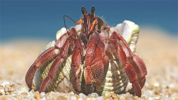 寄居蟹看起来也像螃蟹,但它跟瓷蟹的亲缘关系更近。摘掉它背上的壳,你就会发现寄居蟹的腹部弯曲而柔软,不像螃蟹那样有坚硬的甲壳保护,所以它只能躲在其他动物留下的空壳中生活。