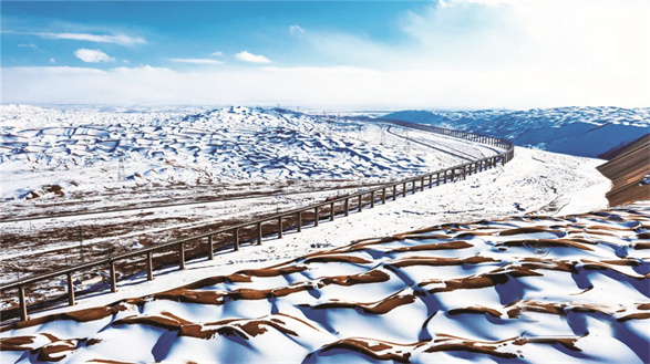 罕见的雪后大漠奇观 近期受冷空气影响,甘肃河西地区迎来大范围降雪天气。沙漠戈壁被皑皑白雪覆盖,连绵不绝的沙丘上形成虎斑纹样,如同一幅清秀淡雅的水墨画。敦煌铁路穿越其中在绝美落雪戈壁中延伸,列车缓缓驶过。