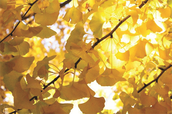 黄色叶树种。高大乔木,银杏叶子呈扇形,在种子植物中很特别。观赏价值极高,常被用作园林植物及行道树植物。