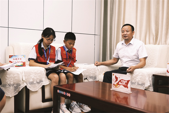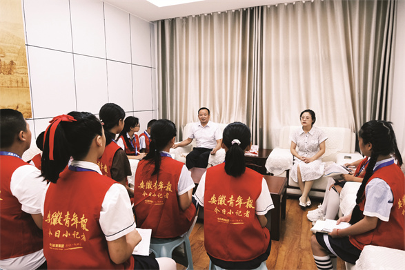 之后,学生记者们又采访了太湖县教育局党委书记、局长王振奋,以及团太湖县委书记李雯,很多学生记者尽管是初次采访,但通过充分的准备,身穿红马甲的他们很快都进入了角色,举手投足间,无不彰显着专业记者的风采。他们之间会交流一些什么话题呢?一起来看看吧!