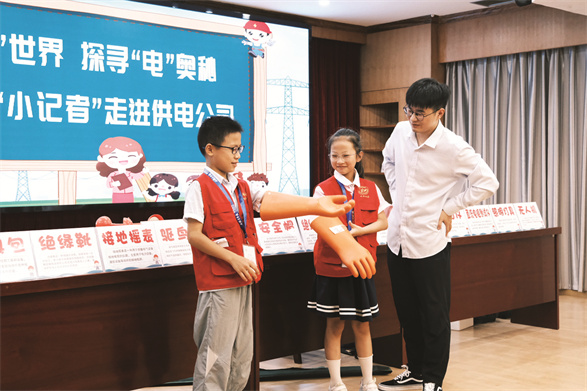 万用表、红外测温仪、绝缘操作杆……为让学生记者直观地了解这些电力装备的无穷魅力,看完宣传片,陈一凡叔叔为大家带来了生动的科普课,学生记者们认真聆听讲解,仔细做着笔记,互动环节更将活动推向了高潮。“电力工作严谨,一点不能出错。电力人可以游刃有余地处理复杂的电网,他们真棒!”有学生记者赞叹道。