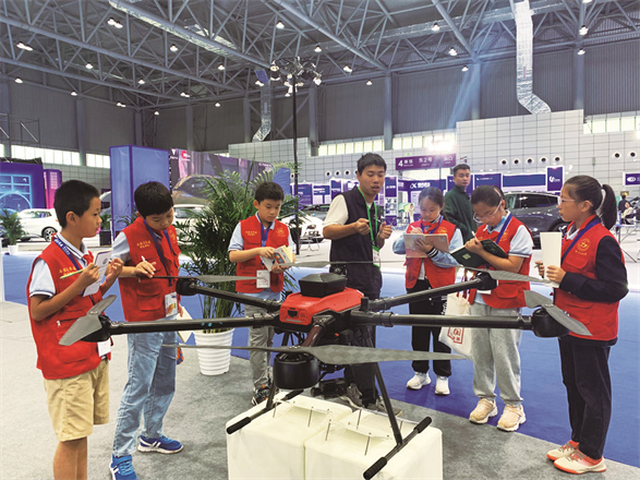 紧接着,学生记者又来到了无人机展区,这时,一架巨大的无人机出现在学生记者的眼前,它的身上几乎布满了螺旋桨,据这里的场馆解说员叔叔说,正是因为这些螺旋桨,它才能达到每小时300千米的速度。这架无人机的用处有很多,它既可以协助警察叔叔快速抓捕犯罪分子,又可以及时运送物资,解决燃眉之急。正当学生记者在感叹时,旁边一架红色的无人机又吸引了大家的眼球。解说员告诉学生记者,这架无人机的底部有着一根喷水管,每当发生火灾时,无人机中的定位系统可以协助喷水管又快又准地扑灭大火。听完解说员的介绍,学生记者们啧啧称赞!四(17)中队张瀚文就说:“这次会展真让我大开眼界!”