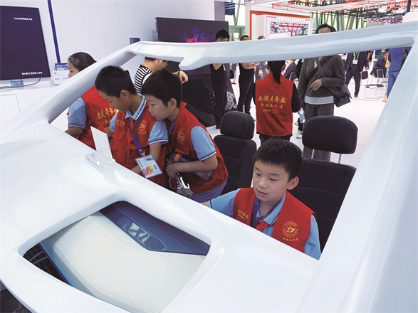 在老师的带领下,学生记者们首先来到了四号展馆,各种各样的高科技产品映入眼帘,让学生记者目不暇接。不过最引人瞩目的还是那大大小小的新能源汽车,什么是新能源汽车呢?场馆工作人员告诉学生记者,新能源汽车是指采用非常规的车用燃料作为动力来源,综合车辆的动力控制和驱动方面的先进技术,形成的技术原理先进,具有新技术、新结构的汽车。听完工作人员的讲解,当发现新能源的车门居然可以360度旋转,学生记者邓至临不禁竖起大拇指。