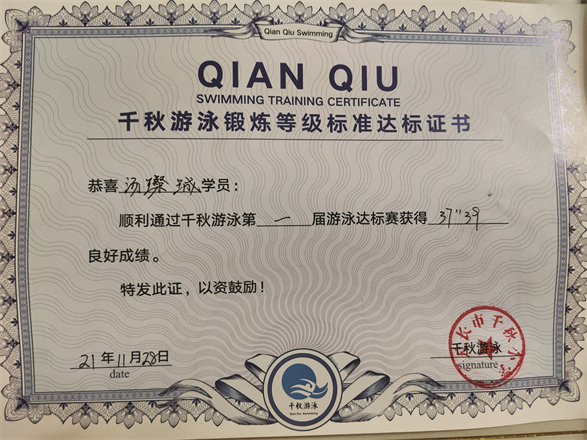 两年前,妈妈带我去千秋游泳馆学习游泳,我的游泳之路就此开启。游泳馆里的教练可严厉了,同时也很认真负责,手把手地教我游泳姿势、动作,指导我怎么去游,向我传授了许多技巧。经过一段时间的训练,我成功学会了游泳,在2021年11月份我参加了千秋游泳馆第一届达标赛,并取得了不错的成绩。今年7月份,我又有幸参加了滁州市首届青少年游泳锦标赛,并在100米蛙泳比赛项目中取得所在组别第一名。
