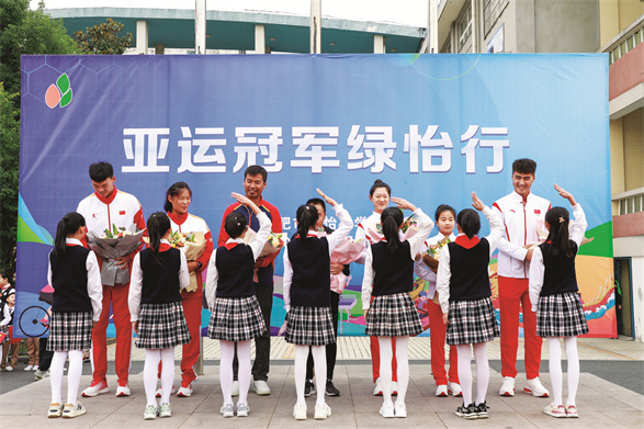 10月9日上午,杭州亚运会赛艇男子八人单桨有舵手项目冠军徐桥、女子八人单桨有舵手项目冠军俞思源、女子组龙舟200米、500米、1000米直道竞速赛三项冠军李智娴,在安徽省水上运动管理中心主任陶大浪、赛艇队主教练杨栋栋的带领下,走进合肥市绿怡小学,开展中华体育精神宣讲活动。