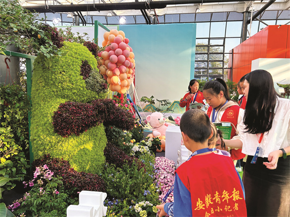 随后,学生记者们来到2号展馆,这里分布着安徽省内各市及合肥市各县区展厅,黄山松、兰花、绣球、石榴、菊花……在琳琅满目的展品中,学生记者们被憨态可掬的大熊猫绿雕造型吸引了目光,大家径直来到美迪花世界展区,“哇,这也太可爱了吧!”学生记者张扬子辰赞叹道。“这个大熊猫设计非常新颖,原来用植物做成的动物造型也这么可爱。”学生记者许欣妍也在展位前啧啧称奇。