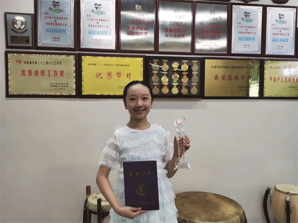 功夫不负有心人,历经4年的刻苦学习,我终于赢来了丰硕的成果。今年夏天,经过层层推荐和筛选,我凭借尽心尽力的表演,在第27届“中国少儿戏曲小梅花荟萃”活动(个人项目业余组)中一举摘得“小梅花”金奖;在第九届“和平杯”少儿京剧小票友邀请赛决赛中脱颖而出,荣获全国一等奖,并摘得中国京剧“十小名票”的头衔。这些荣誉对我而言是莫大的鼓励。