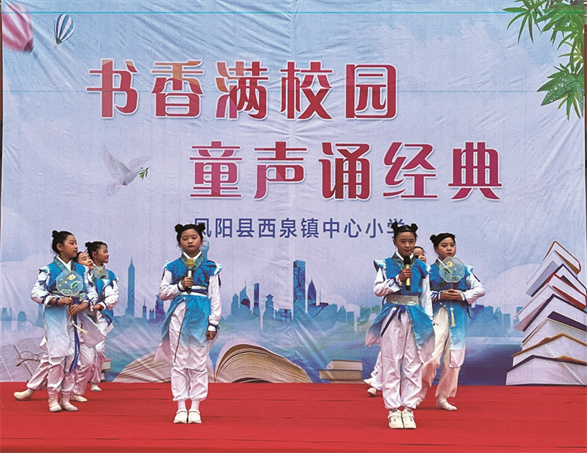 一周快报 凤阳县西泉镇中心小学 书香满校园 童声诵经典 □蒋玉松 近日,凤阳县西泉镇中心小学举行“书香满校园 童声诵经典”经典诵读比赛。活动中,学生们朗诵了《少年中国说》《中国话》《让祖国永放光芒》等经典作品,稚嫩的童声合着经典作品,让师生们从心底感悟了中华千古美文的神韵,感受到“美的享受,德的熏陶,智的启迪”。