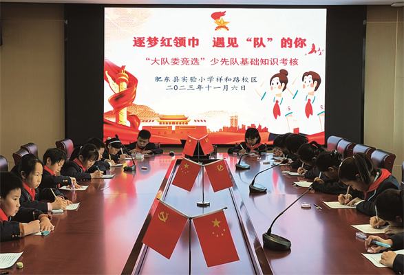 肥东县实验小学祥和路校区 逐梦红领巾 □姚 蕾 近日,肥东县实验小学祥和路校区开展了“逐梦红领巾 遇见‘队’的你”2023~2024学年度少先队大队委竞选活动。本次竞选的第一个环节是少先队理论知识测试。笔试结束后,队员们又用手中的画笔表达着对大队委工作的热情和向往,一张张图文并茂的精美海报,一句句坚定有力的竞选口号,展现了候选人自信自强、积极向上的精神风貌!