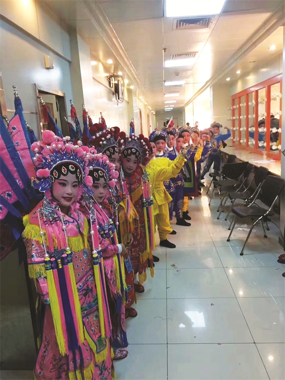 “台上一分钟,台下十年功”。每周四,社员们在老师的带领下认真刻苦地训练,练声、吊嗓、形体训练, 唱、念、做、打一个也不落。社团里年龄最小的是戴意乔同学,别看年纪小,但学戏已有2年时间。一次课间活动时,她经过戏曲教室听到了其他小朋友吊嗓子的声音,一下被吸引住了,“觉得特别好听,我义无反顾地加入了戏曲社团。一开始我觉得学戏曲也不过是吊吊嗓子,走走圆场,再加上自己有舞蹈功底,觉得学戏应该不是一件难的事。但是真正的训练却特别苛刻与艰苦,因为从心底里喜欢,就一直坚持到现在。”小乔说。