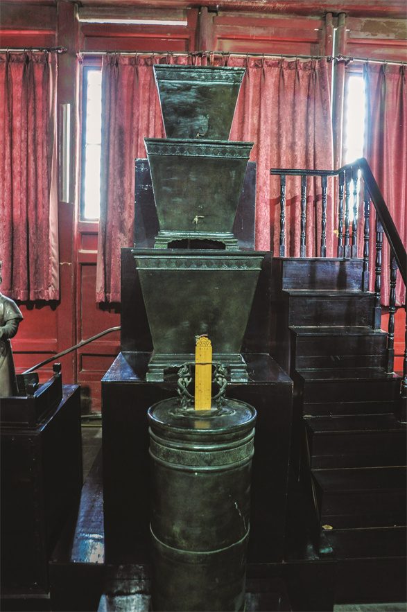 刻漏也称漏刻,是古代的一种计时器。漏是指带孔的壶,刻是指附有刻度的浮箭。简单地说,水从上端的漏壶孔流出,流入下端的壶内,该壶内的浮箭就会随水面的上升而上升,这样通过观察浮箭上的刻度就能知道当前的时间了。为了得到均匀水流可设置多级漏壶,这样就不会因为一个漏壶内的水量多少而影响水流的快慢了,从而达到更为精准的计时。