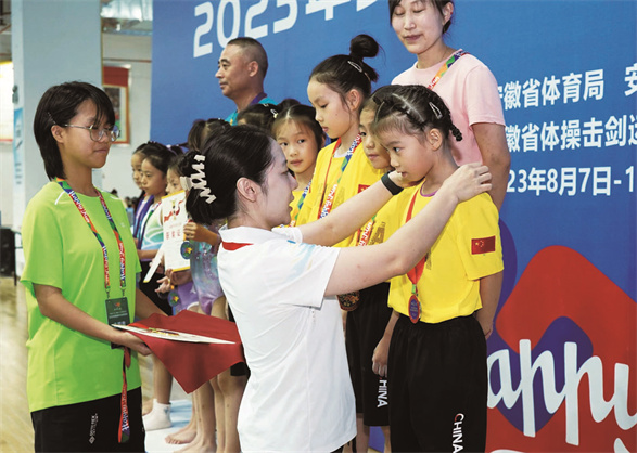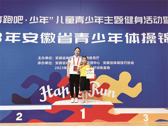 去年夏天对我而言是个重要的转折点,我赶往滁州参与了为期2个月的集中训练。在此期间,我严格按照教练的指导认真训练,没有父母的陪伴,每每遇到挫折的时候,我都会自己调整好心态。终于,在2023年安徽省青少年体操锦标赛上,我获得女子U8组团体冠军、高低杠冠军、自由操冠军、跳马第二名、女子U8组全能第三名、平衡木第五名。最令我感到自豪的是,我还取得了“国家一级运动员”的荣誉称号!