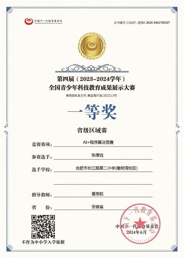 接触了计算机后,我发现自己非常喜欢信息学、人工智能等。经过一年多时间的学习,在校内外老师的精心培养与引领下,五年级时我先后参加了庐阳区级、合肥市级、安徽省级信息学科普日活动以及全国青少年科技教育成果展示大赛、全国青少年信息素养大赛等多项比赛,并屡获佳绩。