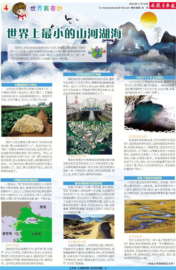 同学们,你见过抬脚就能跨过的山与河、街道那么宽的海峡、只能容纳十几人的湖、几百步就能走出的沙漠以及乘一艘小船就能跨越的海么?它们如同岩石、水沟、沙地一般大小,是如何获得“山”“河”“湖”“海”的称谓的呢?今天就和小米姐姐一起去一探究竟。