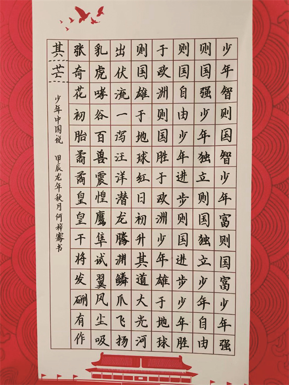 回首这段练字的经历,我深有感触:学习书法只是我人生旅程中的一段插曲,今后我还有很多的路要走,无论前方的路有多么艰难,只要我保持耐心和专注,我就能走过去。
