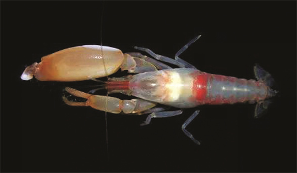 来看看这位自带武器的威武朋友。它叫枪虾,名字简直是量身定做的,其最明显的特征是两只不对称的螯(áo)。其中那只大得不成比例的螯是它们的致命武器,可以利用气泡作为“子弹”,击晕甚至杀死敌人或猎物。这致命一击产生的声音可以达到210分贝,比真实的枪声(平均约为150分贝)还要响亮。