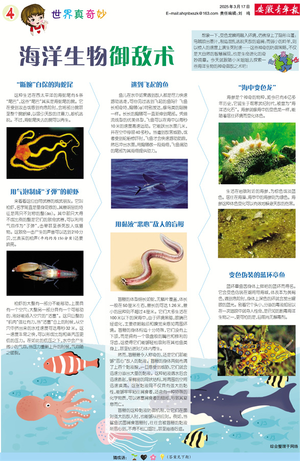 想象一下,变色龙瞬间融入环境,仿佛穿上了隐形斗篷;乌贼喷出墨汁,制造混乱逃脱天敌的追捕;而弱小的羚羊,则以惊人的速度上演生死时速……这些神奇的防御策略,不仅是大自然的智慧展现,也是生命进化的奇妙篇章。今天就跟随小米姐姐去探索一些海洋生物的神奇御敌之术吧!