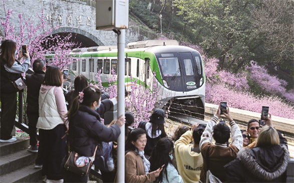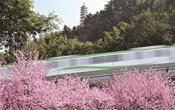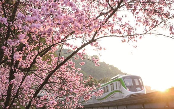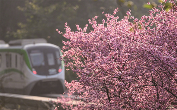 炫NEWS 开往春天的列车 近日,重庆春日限定花海列车已发车。天气转暖,大面积美人梅竞相绽放,列车穿行在粉色“花海”之中,就像是误入了梦幻的童话世界。