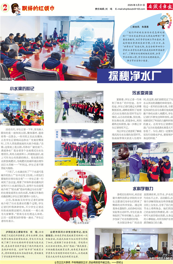 庐阳区关工委秘书长 任 琨:活动构建了沉浸式科普课堂,将专业讲解、实地观摩与趣味实验有机结合,学生们不仅直观了解了污水处理的科学原理与技术流程,更在动手实践中感受了现代科技对生态保护的价值。这种“做中学”的教育方式,将环保理念具体为切身体验,有效激发了学生探索科学的兴趣。