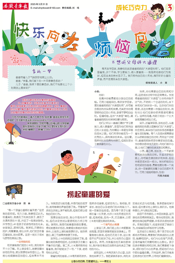 这次经历让我明白,每个孩子的心灵都纯洁而美丽,需要我们用真诚的心去发现、触摸和呵护。他们内心的淘气天使,正等待着我们用爱和耐心去感化。孩子的进步需要时间和过程,我们需要俯下身来,倾听他们内心的声音,捞起他们内心中那份童趣的爱。只有这样,我们才能真正走进他们的世界,引导他们健康成长。