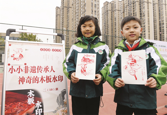 在庐州木版水印展台前,省级传承人王泽龙老师手持木版,详细讲解从选材、雕刻到印刷的每一道工序,展示非遗魅力。“木版水印不仅是技艺,更是文化传承,每块木板都承载了历史记忆。”王泽龙老师一边介绍,一边鼓励学生们亲手尝试,感受木板与纸张的奇妙互动。