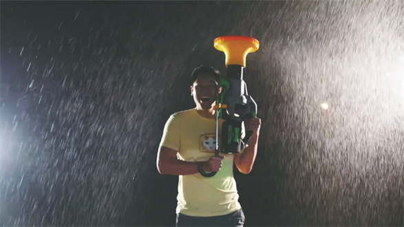 长棍其实是一把“空气伞”。它的伞面是隐形的,长棍能吸入空气,空气在棍内被加速,再从上方喷出,形成一片气流屏障,将落下的雨水都吹走。还有人将能喷出空气屏障的装置安装在头盔上,制成不用手持的空气伞。