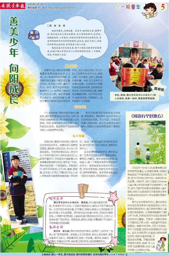 《河边有个好地方》的故事背景设定在西安市临潼区,以真挚的情感、细腻的笔触描绘了村舍校园以及那清亮的小河旁,孩子们在成长过程中的一段美好时光的故事。2024年,该片入围波兰Kinolub儿童与青少年国际电影节主竞赛单元 ;同年,该片入围中国电影金鸡奖最佳儿童片提名,同时入选教育部与中宣部联合发布的《第42批向全国中小学生推荐优秀影片片目》。 影片以乡村教育为切口,通过女校长的传统压制式教育与粉提老师的人本化教育形成鲜明对比,揭示教育环境对儿童心理的深远影响。以温柔笔触解构“问题少年”标签,在笑泪交织中完成对教育异化的批判与重建。它既是一部献给教育工作者的启示录,也是一曲致童年本真的田园诗。晨雾中的河岸、夕阳下的麦田、星空下的校园,均成为角色情感的外化载体。配乐采用陕西方言童谣与轻快钢琴曲交织,既烘托童真氛围,又暗含成长阵痛。尽管结局略带理想化色彩,但其“许人以希望”的叙事策略,恰是儿童片抚慰人心的核心价值。