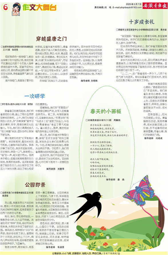 一次研学 □怀宁县月山镇中心学校六(5)班 章思祺 随着春日的暖风轻拂,我们怀着激动的心情,踏上了前往岳西劳动基地的旅程。上午,我们化身田间的小农夫,在“农耕课堂”里学习亲手播种、除草,感受农耕文化的魅力。午后,我们活力满满地投入“动力神圈”挑战,团队协作让默契不断加深。 最让我难忘的是“红军射箭训练营”。来到射箭场,看到长长的弓和箭,心里既兴奋又紧张。教练讲解了技巧后,我站在起射线前,双手微抖,深吸一口气,瞄准靶心,“嗖”的一声,箭矢破空而出。虽然未中靶心,但看到箭稳稳落在对方场地,我满是成就感。这次射箭锻炼了我的专注力,也让我学会了在压力下保持冷静,明白了耐心和坚持的重要性。 夜幕降临,我们在“军营夜训”中感受纪律的严肃,对军人的敬意油然而生。第二天,鸟鸣唤醒我们,迎接新的挑战,“石墨涂鸦”和“传统木工坊”激发了创造力,午后的“勇者攀岩”考验了勇气和毅力。篝火晚会上,歌声、舞步和说唱为旅程画上完美句号。 第三天,我们在晨光中整理行囊,参观“王步文故居”和烈士陵园,深刻体会先辈们的英勇与伟大。午后,在青云峡放松身心,感受大自然的宁静。夕阳西下,我们带着满满的收获和回忆踏上归途。 这次研学,我们不仅收获了知识,更收获了友谊和成长。回到校园,心中已种下期待下一次冒险的种子。 指导老师 刘爱萍