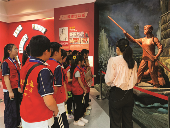 踏入馆中,学生记者们立刻被馆内庄重而充满故事感的氛围所吸引。在讲解员的带领下,大家首先来到劳模事迹展区,“这些劳模们太厉害了!他们是怎么做到的?”学生记者余亦心眼中满是敬佩地问道。讲解员微笑着讲述起渡江战役一等功臣马毛姐的故事,看着实景雕塑,仿佛能看到马毛姐在战火中无畏前行,为解放军领航渡江的英勇画面。