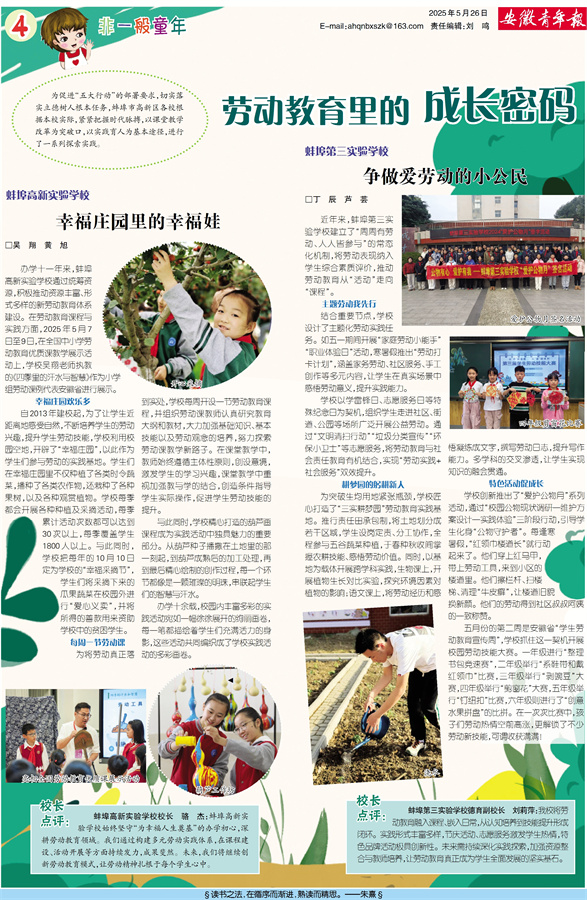 近年来,蚌埠第三实验学校建立了“周周有劳动、人人皆参与”的常态化机制,将劳动表现纳入学生综合素质评价,推动劳动教育从“活动”走向“课程”。
