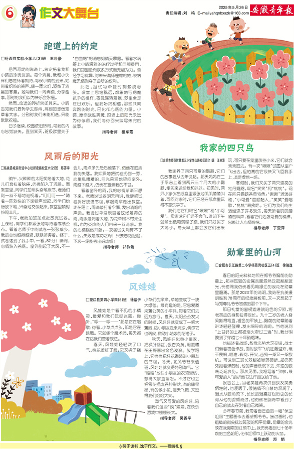 跑道上的约定 □岳西县实验小学六(3)班 王世豪 岳西河堤的跑道上,曾定格着我和小晴的珍贵友谊。每个清晨,我和小伙伴们总是怀着期待,等候小晴的到来,她带着炽热的笑声,像一团火焰,驱散了清晨的寒意。她与我们一同奔跑,分享趣事,那时的我们以为快乐会永恒。 然而,命运的转折突如其来。小晴告知我们要转学去滁州,离别的悲伤笼罩着大家。分别时我们未能相送,只能默默祝福。 日子继续,校园依旧热闹,可我的内心总觉缺失。直到某天,班级群里关于“白血病”的消息如晴天霹雳。看着水滴筹上小晴艰难的治疗过程和巨额费用,我们却因没有联系方式而无能为力。曾经学习优异、对未来满怀憧憬的她,被病魔无情剥夺了追梦的权利。 此后,担忧与牵挂时刻萦绕心头。课堂上思绪飘远,想象她与病魔抗争的模样;夜晚辗转难眠,梦里全是往日欢乐。但我始终相信,那些共同奔跑的时光,已化作心底的力量。小晴,愿你战胜病魔,跑道上的阳光永远为你停留,我们等你回来续写未完的故事。 指导老师 祖军霞