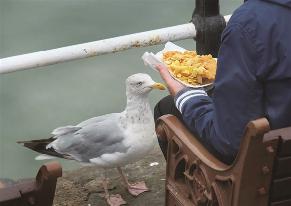 嚣张的海鸥干扰了游客与当地人的生活,甚至有人研究起了怎么防止海鸥打劫。他们找到了一个简单的办法——靠着墙吃东西,遇到海鸥时盯着它看。海鸥看起来天不怕地不怕,但其实主要靠背后袭击来抢食;与人正面对视时,它可能会心虚溜走。