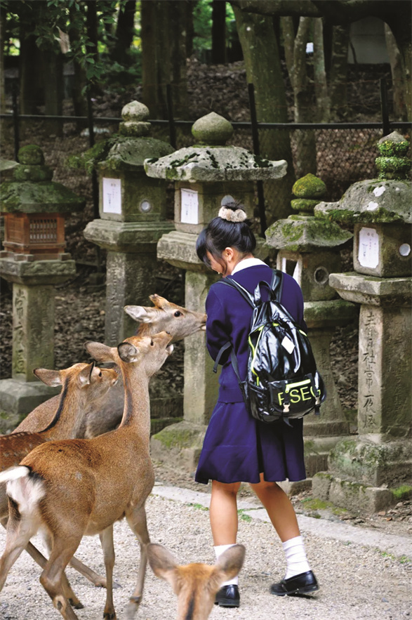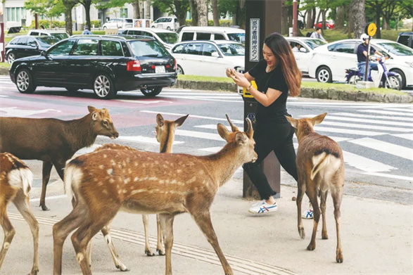 人类的友好使梅花鹿常常热情过头。奈良有专门用于投喂它们的饼干,在饼干售卖点,一大群梅花鹿已经守在一旁等着游客掏钱了。只要它们看见某个人买了饼干,就会一拥而上,把他手里的饼干、地图和纸巾都吃掉,让人哭笑不得。