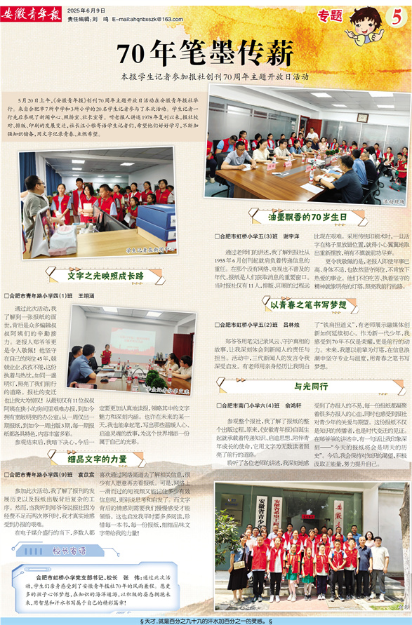 合肥市虹桥小学党支部书记、校长 张 伟:通过此次活动,学生们亲身感受到了安徽青年报社70年的风雨兼程。愿更多的孩子心怀梦想,在知识的海洋遨游,以积极的姿态拥抱未来,用智慧和汗水书写属于自己的精彩篇章!