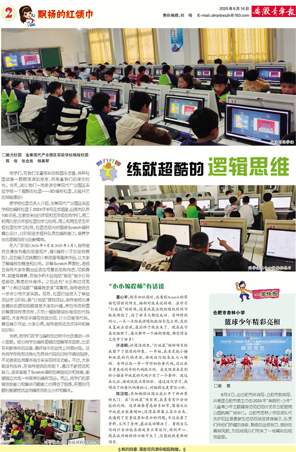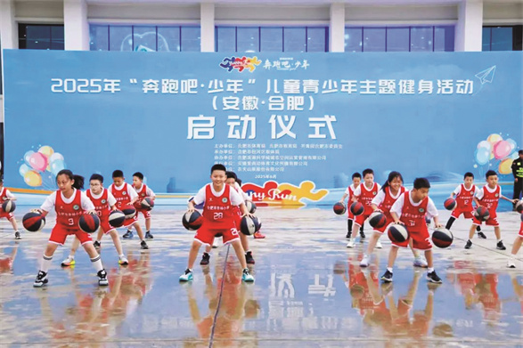 一周快报 合肥市杏林小学 篮球少年精彩亮相 □俞 凯 6月2日,由合肥市体育局、合肥市教育局、共青团合肥市委主办的2025年“奔跑吧·少年”儿童青少年主题健身活动启动仪式在合肥骆岗公园航南广场举行。合肥市杏林小学篮球队代表庐阳区受邀参加活动现场篮球操展示,队员们用他们矫健的身姿、熟练的运球技巧、良好的精神风貌,为现场观众们带来了一场精彩的视觉盛宴。