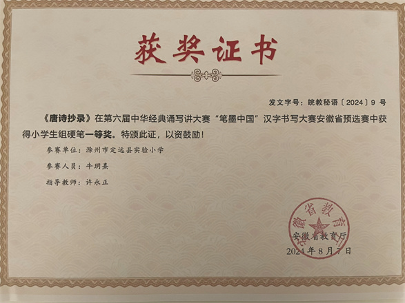 练习书法的过程,是一场与耐心和毅力的较量。每当笔尖划过纸面,沙沙的声响如同美妙的乐章,让我沉浸其中。从最基础的握笔姿势开始,到横平竖直的笔画技巧,再到精妙的间架结构、独特的书写韵味,每一次进步都凝结着无数汗水。在老师的悉心指导下,我在学校的书法比赛中崭露头角,很快,我便代表学校征战县级青少年硬笔书法大赛。在定远县“迎新春”“双拥杯”“普法杯”“党是阳光我是苗”等一系列比赛中,我凭借扎实的功底,屡屡斩获一等奖、特等奖,这些荣誉成了我继续前行的动力。