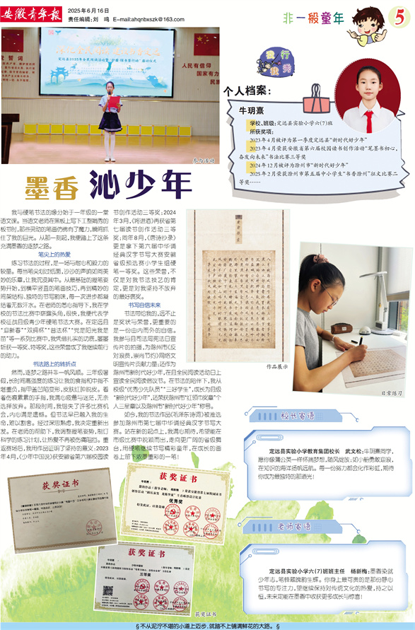 书法带给我的,远不止是奖状与荣誉,更重要的是一份由内而外的自信。我参与县司法局宪法日宣传片的拍摄,为滁州市《反对浪费,崇尚节约》网络文明宣传片贡献力量;还作为滁州市新时代好少年,在县全民阅读活动日上宣读全民阅读倡议书。在书法的陪伴下,我从校级“优秀少先队员”“三好学生”,成长为县级“新时代好少年”,还荣获滁州市“红领巾奖章”个人三星章以及滁州市“新时代好少年”称号。