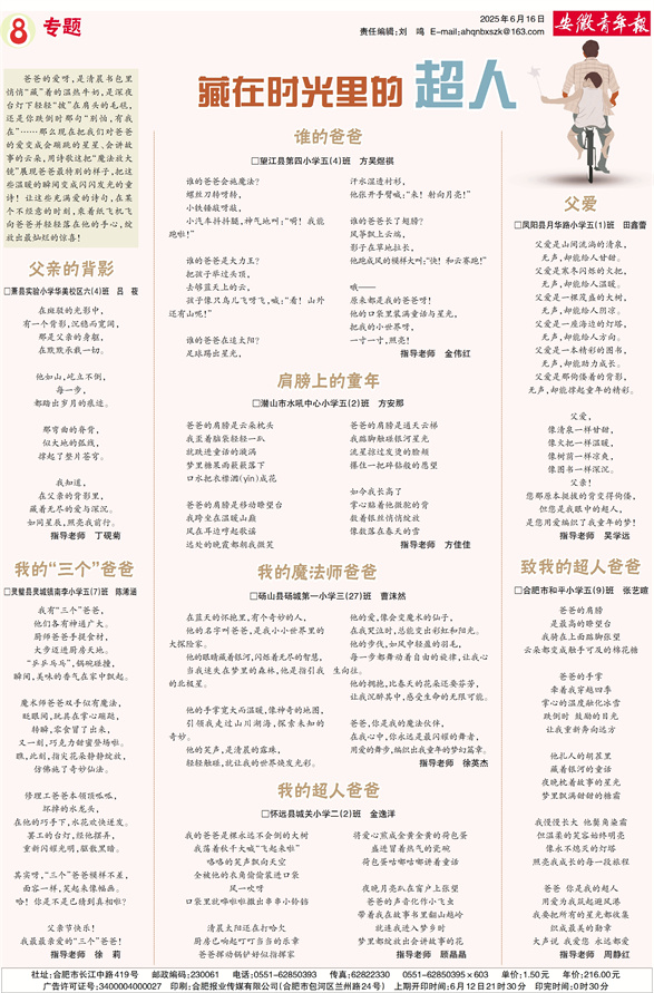 爸爸的爱呀,是清晨书包里悄悄“藏”着的温热牛奶,是深夜台灯下轻轻“披”在肩头的毛毯,还是你跌倒时那句“别怕,有我在”……那么现在把我们对爸爸的爱变成会蹦跳的星星、会讲故事的云朵,用诗歌这把“魔法放大镜”展现爸爸最特别的样子,把这些温暖的瞬间变成闪闪发光的童诗!让这些充满爱的诗句,在某个不经意的时刻,乘着纸飞机飞向爸爸并轻轻落在他的手心,绽放出最灿烂的惊喜!