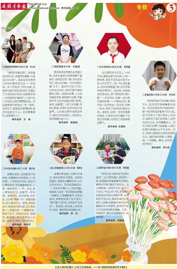 亲爱的李老师,记得有次考试,我的成绩很不理想。您走进教室时,我紧张地攥紧衣角,以为会迎来批评。可您却温柔地说:“一次失利不算什么,找到问题,继续努力就好!”您的鼓励话语像一股暖流,让我重新振作,后来的考试,我果然取得了很大进步。“新竹高于旧竹枝,全凭老干为扶持”。李老师,成长路上有您相伴,真好!愿岁月对您温柔以待!