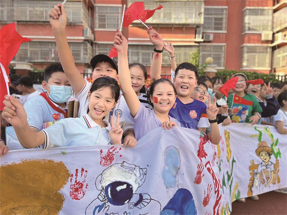 社团的学习内容初期以临摹为主,培养观察力和耐心;熟练后尝试结合古诗创作,比如用淡墨画“孤舟蓑笠翁”,用朱砂点染“红掌拨清波”;现在高年级同学已经开始自由创作,蒋可欣同学就把航天元素融入传统水墨,她的《星辰少年——才艺与梦想同行》在2024年安徽省中小学艺术展演中斩获三等奖。
